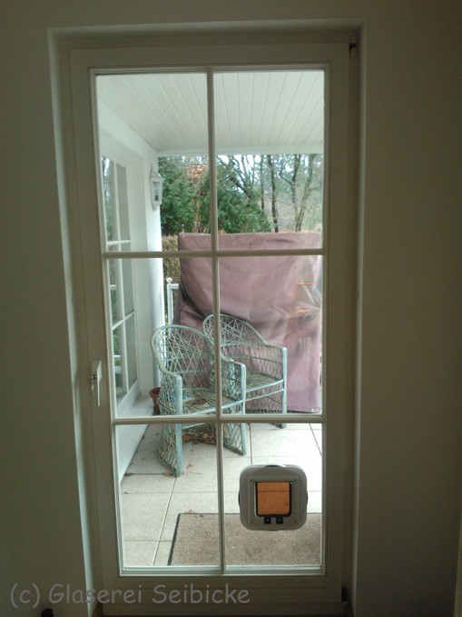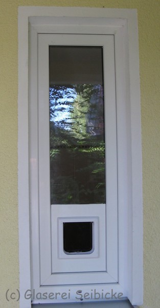 Wenn die Scheibe größer ist, eine Terassentür beispielsweise, kann eine Isolierglasscheibe auch mit einem Lochausschnitt gefertigt werden und so die Katzenklappe direkt in die Isolierglasscheibe eingebaut werden.
